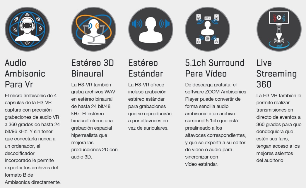 • Tres modos de grabación: Ambisonics, Stereo Binaural o Standard Stereo
